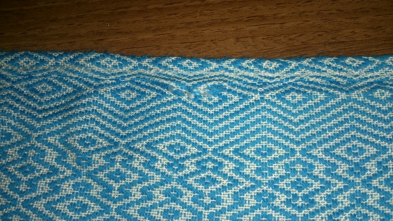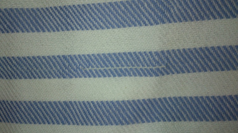 2. Олдхопп бело-голубые полосы, 6. В хорошем для своего возраста. Пятен, дыр нет. Есть свойственные ручному (а их ткали тогда вручную) узелки и почин разрыва нити на уровне метки середины. В намотке не видно. Ширина - 80 см, длина 474 см. Простроченная метка середины, синяя этикетка, борта отличают от основного полотна по плетению. 3000