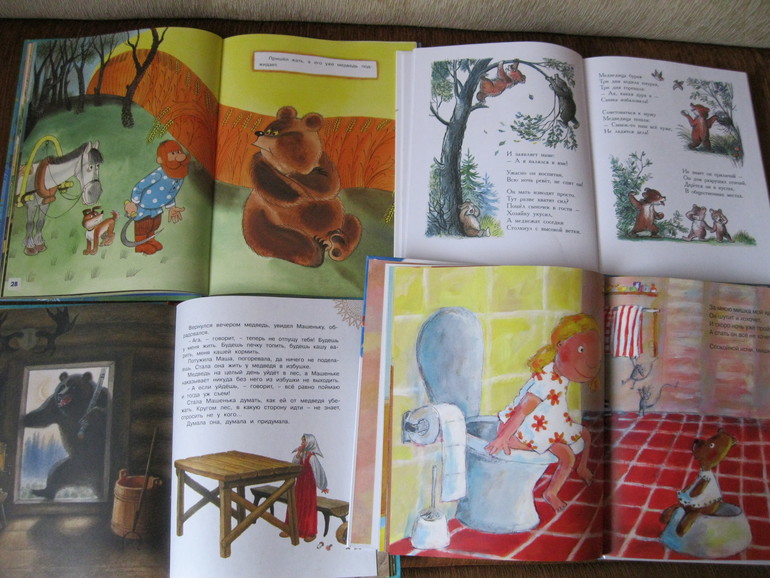 Самые любимые медведи среди них русские народные - у нас с чудесными иллюстрациями Устинова (повторяюсь сейчас, но чем больше мы читаем книгу "Русские сказки о животных", тем больше она мне нравится). Хит апреля - сказка "Три медведя" (начали читать ее еще в марте), в конце апреля к ней добавилась "Маша и медведь". Эти сказки мы читаем не меньше трех раз подряд. А потом книжка "устает" и идет отдохнуть)