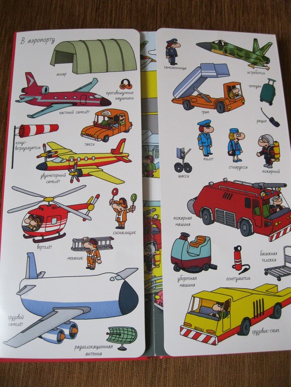 Из автомобильного (этот пункт, как вы понимаете, у нас обязательный в программе) листали парочку энциклопедий от Росмэна из библиотеки, но поняла, что до обычных энциклопедий мы еще не доросли. Зато доросли до лежавшей на полке "Найди и покажи. Транспорт" от Клевера - не скажу, что зависаем по полчаса, но начал задавать вопросы, искать отдельные машины, отдельных персонажей. В книге всего 5 разворотов (в аэропорту, в пробке, на стройке, на вокзале, в порту), ниже первый разворот.