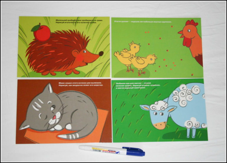Если все это его не увлечет, я припасла рисовальный набор для самых маленьких "Каляки-маляки". Он состоит из 20 двухсторонних карточек с заданиями или просто рамочкой и синего маркера. У карточек гладкая поверхность, на которой можно рисовать, стирать и рисовать снова. С собой возьмем только 4.