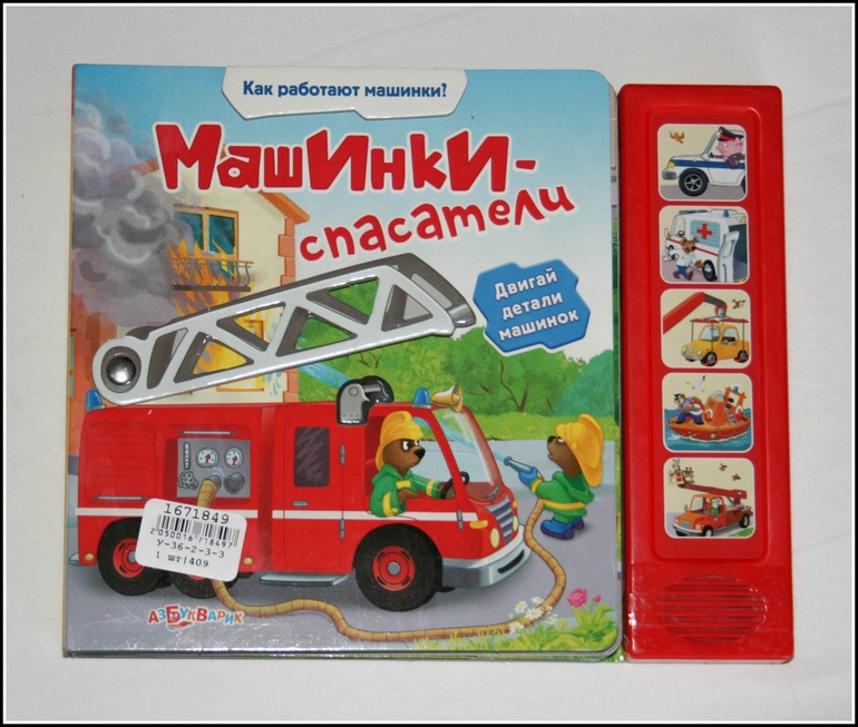Музыкальная книжка "Машинки-спасатели" с подвижными частями, которые Даня так и норовит оторвать и поломать. Динамик заклеен 3 слоями скотча, чтобы пассажиры единодушно не выкинули нас из самолета от душераздирающего рева сирены на весь салон в миллионном количестве раз.