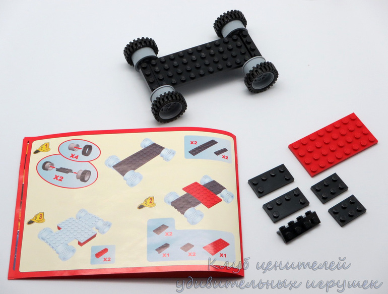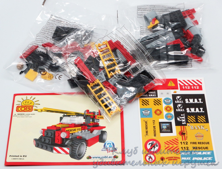 Внутри коробки спрятались три запечатанных пакета с деталями, листок с наклейками и инструкция по сборке.
