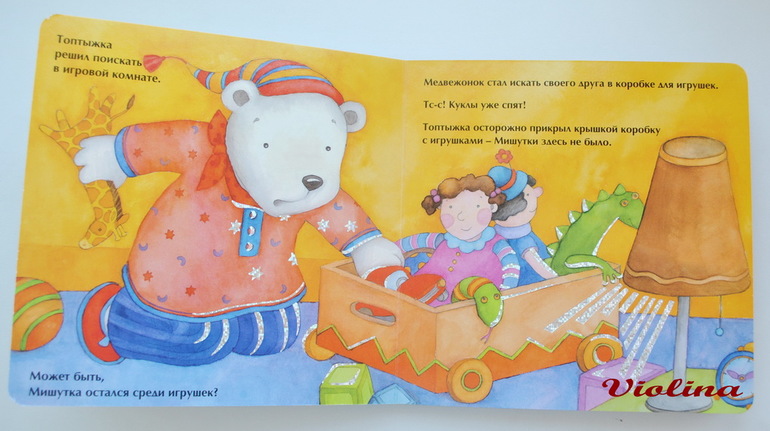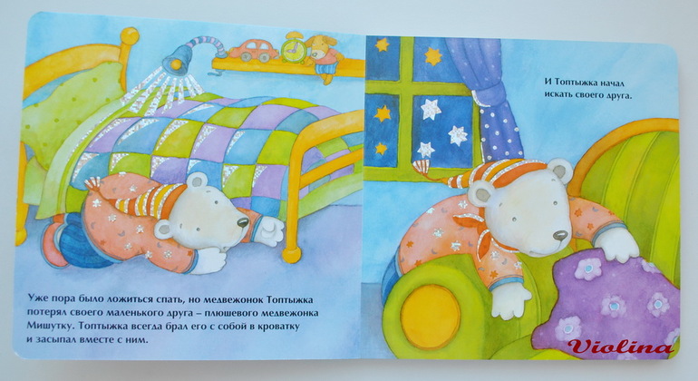 Белый медвежонок перед сном ищет своего плюшевого мишутку. Когда мишутка найден, белый медвежонок ложится спать. Для детей от 1 до 2 лет. На более поздний возраст брать не стоит.