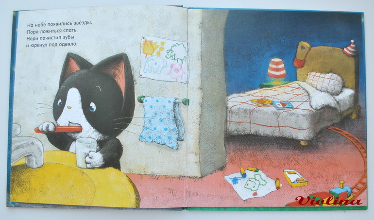 Из всех книжек "перед сном" она дольше всего оставалась фаворитом у моего ребенка. И пусть нам сейчас уже 3 года, но мы до сих пор все равно нет-нет, да и почитаем ее снова. Милейшая история про милейшего котенка, который тоже никак не может заснуть. Он выходит во двор, чтобы проверить что делают его друзья. Он убеждается, что все уже либо спят, либо готовятся ко сну. И каждый дарит котенку что-то, что поможет ему побыстрей заснуть - кто свою игрушку, кто подушку, кто сонное перышко :)