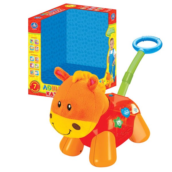 Отличная игрушка с множеством разнообразных функций - лошадка-каталка. У нее есть колеса, чтобы ездить и удобная ручка. Играют различные мелодии. Кнопки светятся, а голова лошадки качается 600 руб