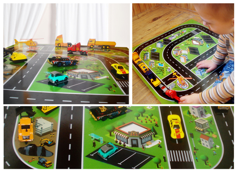 Наименьший член нашей семьи любит поезда, автомобили в общем всё что имеет колеса). Самый большой интерес у него - это возить по любой доступной поверхности всё что может ехать и катится. Пришлось, маме повозится возле компьютера 3 часа и доступная поверхность с разметками дорог готова! Радость была безграничная. Ссылка на файл для печати http://turbobit.net/2g68rkb7bqin.html