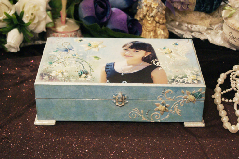 Шкатулка на небольших ножках, выполнена в нежных перламутровых тонах с переходящим цветовым эффектом. Основной цвет - нежно голубой. Для декора так же использовались объемные вензеля с перламутровыми цветами, добавлены элементы ручной работы из холодного фарфора и дополнительно украшены стразами, внутри частично обита материалом с добавлением тонкого слоя синтепона для мягкости. В работе использованы различные, как акриловые, так и синтетические (не токсичные) краски и лаки. Кракелюр (лаковые трещины). Дополнительные элементы покрыты и закреплены эпоксидной смолой, что придает дополнительную прочность и уменьшает риск к откалыванию до абсолютного минимума. Оригинальная фотография прошла корректировку путем замены фона (коллаж оплачивается отдельно, см. п. "как сделать заказ").