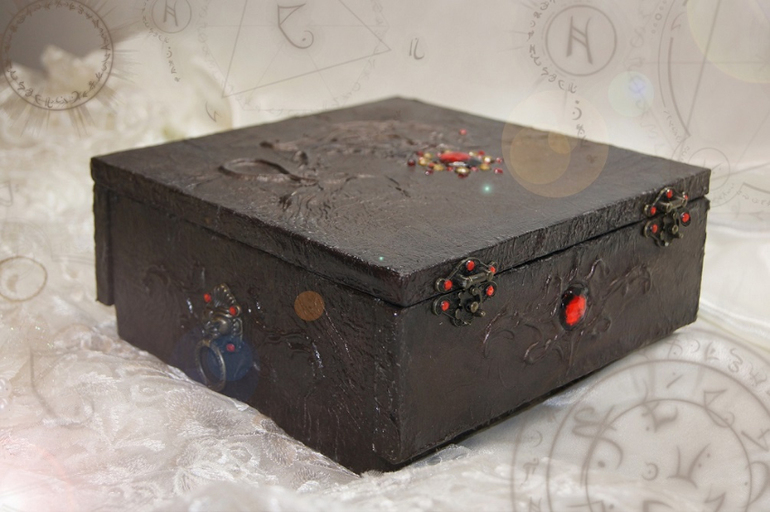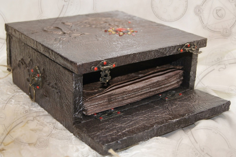 Вариация альбома в деревянном коробе. Листы окрашены в кофе (и цвет натуральный и запах приятный). Налет старины.. Добавлены кружевные завитки на некоторых страницах (хаотично). Альбом так же из холста ручной работы. Стандарт - 20 листов + 2 на обложку, по желанию кол-во листов можно увеличить. Для декора в комплект входят "печати" с королевской лилией. Они выпоены так же на холсте. Есть возможность заказать именную печать. Сроки выполнения в таком случае увеличатся.