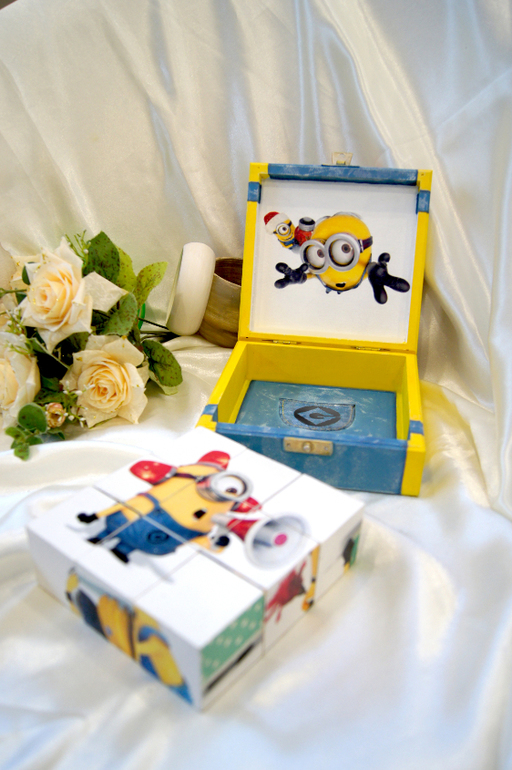 Сегодня закончила новую шкатулку с популярными на сегодняшний день персонажами Миньонами. Так как персонажи детские, решила сделать её как логическую игру - кубики. И моторику развивает и логику, и настроение поднимает.