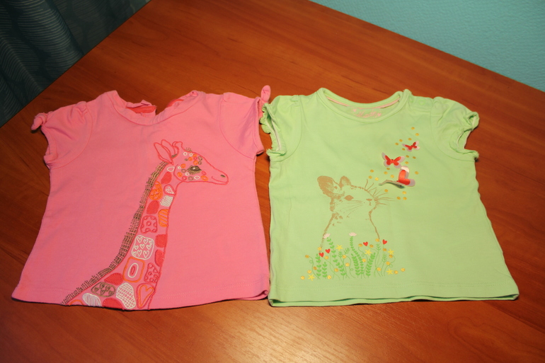 футболочки мазека, с жирафиком одели раз и постирали с зайчиком не одевали, только сняли бирку. с жирафиком 100 с зайчиком 120. обе 3-6 мес