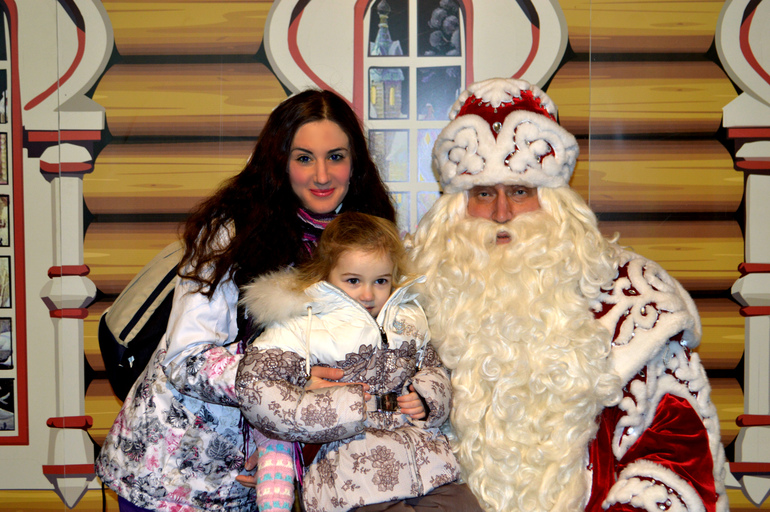 На следующий день в 8.00 мы уже были на Вотчине. Народу там конечно тьма. Молодцы, что не поленились, и поехали так рано. Начали с тропы сказок, на этой тропе нам встречались разные персонажи русских сказок и задавали «наисложнейшие» вопросы, после отправились на прием к Деду Морозу, опять же хорошо, что поехали рано утром, народу, по сравнению с тем, что было дальше, просто не было. Задали вопрос, который очень волновал Есению: «Что кушает Дед Мороз?», на что дедушка ответил: «Кашу, грибы, лесные ягоды», а не сосульки и снег)))) Поблагодарили за подарки и пожелав здоровья дедуле, отправились на перекус в кафе «Снежинка», вот тут тоже нам повезло, мы смогли вклиниться между наплывами групп, ооооочень плотно позавтракали (200 р.-шведский стол, с хорошим ассортиментом, дети до 5 лет бесплатно), отправились смотреть Морозовский терем. И вот тут началась жесть: нескончаемые поток групп, среди которых оказались мы, «помощники-снеговички» рассказывали про комнаты в таком быстром темпе, что даже я не успевала понять о чем и про что говорят, а еще на заднем фоне рассказ уже следующей группе из предыдущей комнаты «немного» мешали воспринять этот терем как сказочный).