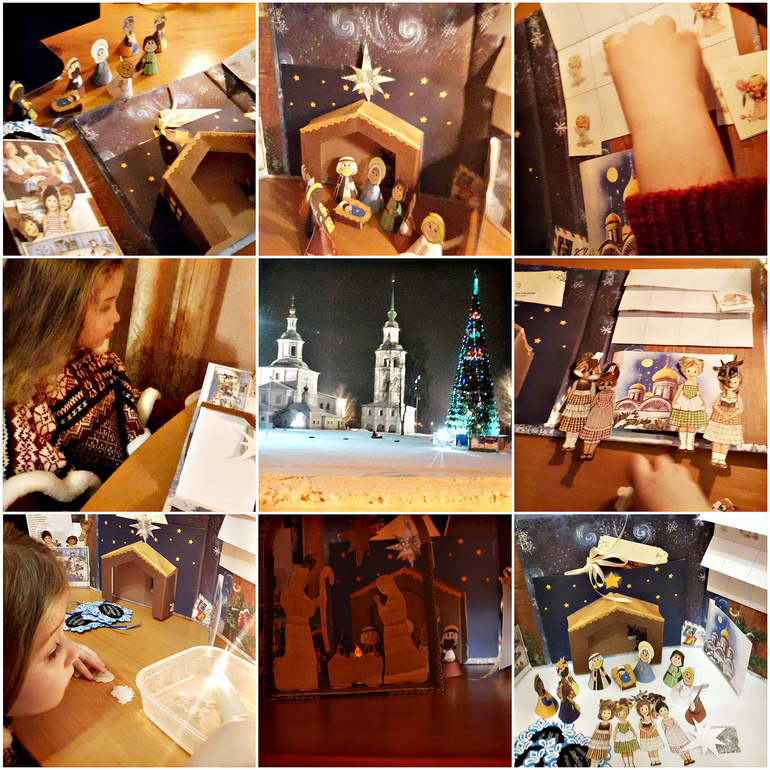 Вечером еще прогулялись по Устюгу и опять пошли кататься на ватрушках, вернувшись, нарядились (канун Рождества) и провели лэпбук «Рождество». Посмотреть можно тут