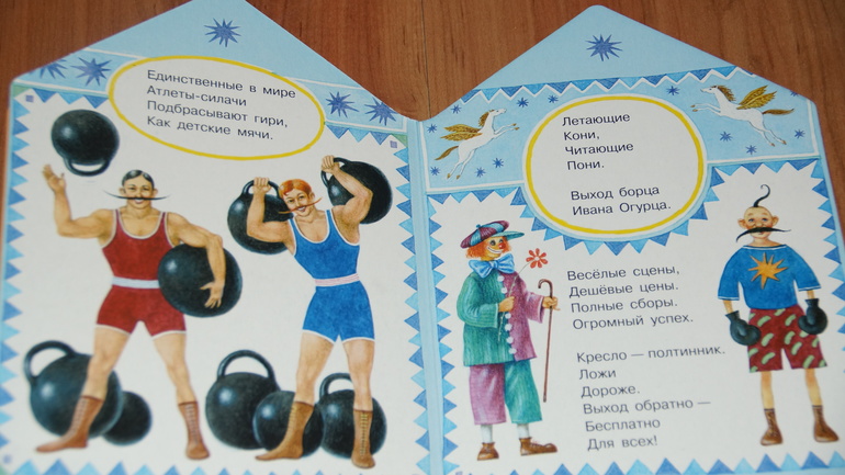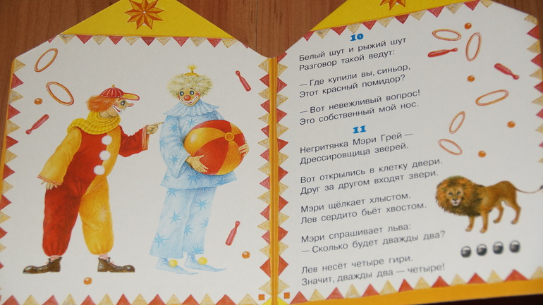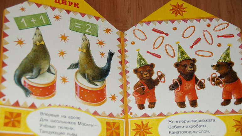 Смущало только то, что это книжка-картонка. Но теперь я понимаю, что это скорее плюс, чем минус. Дочка любит "Цирк", рассматривает часто, странички не мнутся.