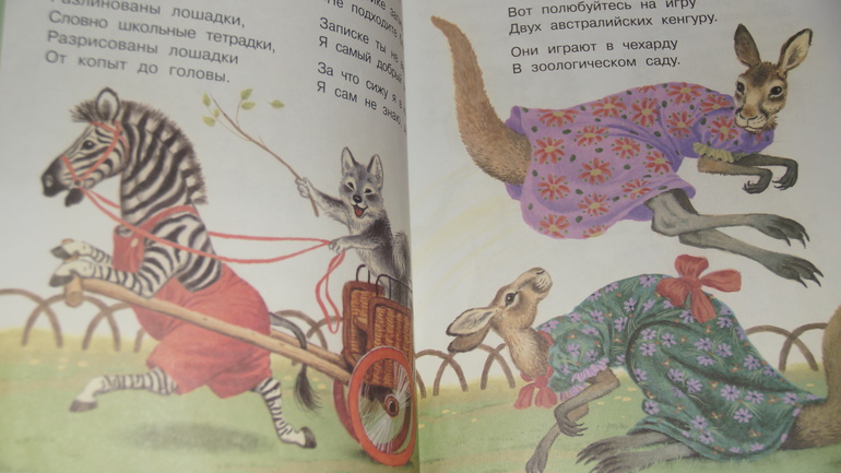"Детки в клетке" оформлены Бордюгом и Трепенок. Очень хочу найти замену этой книжке, но пока не могу, но и показывать ребенку картинки с кенгуру в ночнушках и зеброй в шортиках - выше моих сил.
