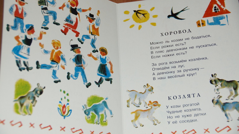 В сборник вошли переводы чешских песенок: "Хоровод", "Козлята", "Сенокос", "А, Бе, Це", "Помогите!", "Улитка", "Олени", "Бабушкины любимцы", "Лягушка на дорожке", "Ласточка", "Добро за добро". Песенки короткие, и их не много, но, мне кажется, этого вполне достаточно, чтобы познакомить ребенка с народной поэзией зарубежной страны.