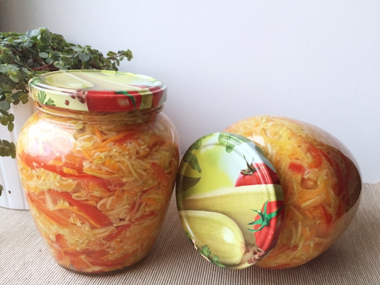 Кабачки (молочные можно со шкуркой, у больших вычищаем семечки и шкурку) и морковь трём на тёрке (я делаю на тёрке для корейской морковки... так красивее) Перец шинкуем тонкими полосками, чеснок пропускаем через давилку. Все складываем в большую миску и добавляем остальные ингредиенты по списку. Тщательно перемешиваем и оставляем на часок, чтобы вкусы и ароматы "переженились"... Салат даст много сока, так что не переживайте о недостатке жидкости. Затем салат выкладываем в чистые банки (из перечисленного количества у меня получилось 2 баночки 750г), прикрываем прокипяченными крышками и ставим стерилизовать в кастрюльке на плите 20минут. После затягиваем до упора крышки, переворачиваем банки до полного остывания и ждём зимы.