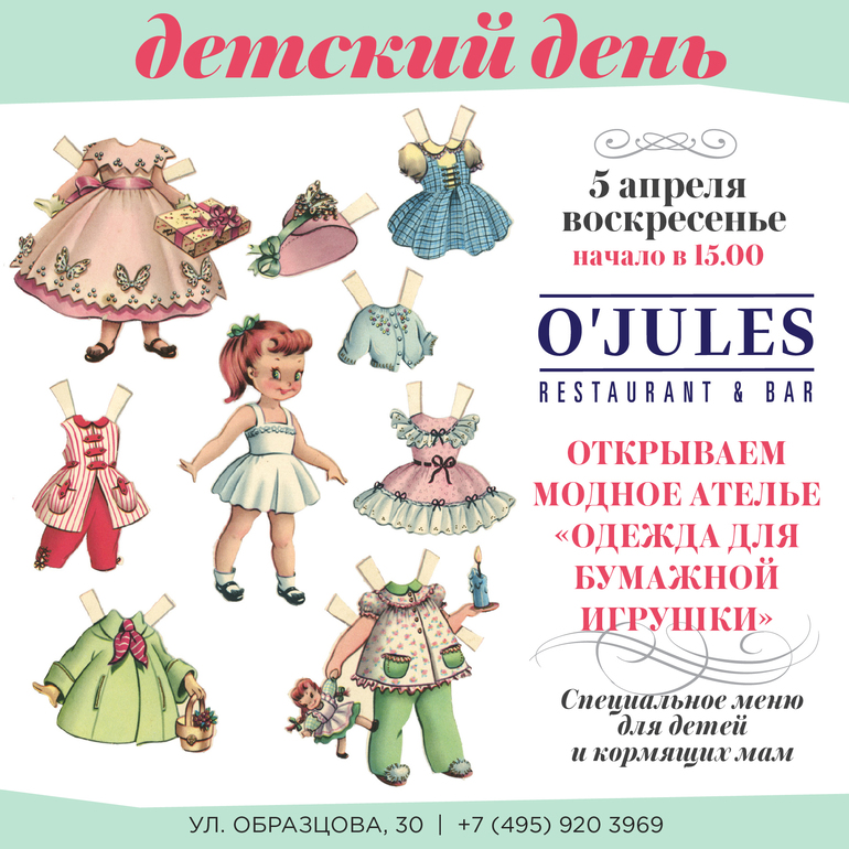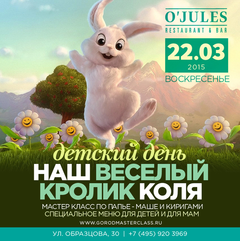 Ресторан O'Jules приглашает Вас провести воскресенье в семейном кругу. Детские дни для самых маленьких и любимых гостей "Наш веселый кролик Коля". Ваши детки не будут скучать и прекрасно проведут время за просмотром мастер классов по папье-маше и киригами, а так же смогут насладиться мультфильмами и специальным детским меню.