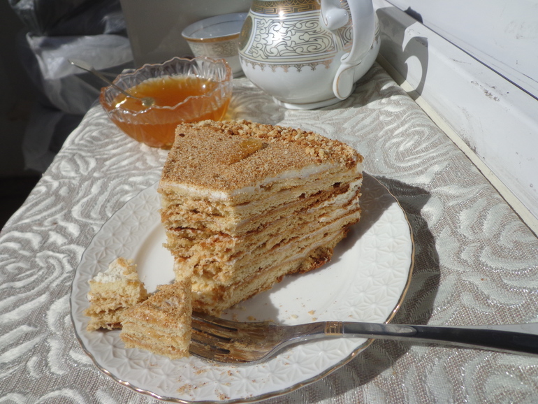 Просмотрела несколько рецептов Медовика, но остановилась на этом рецепте. Получились очень нежные коржи и нежный крем, с кислинкой лимона.