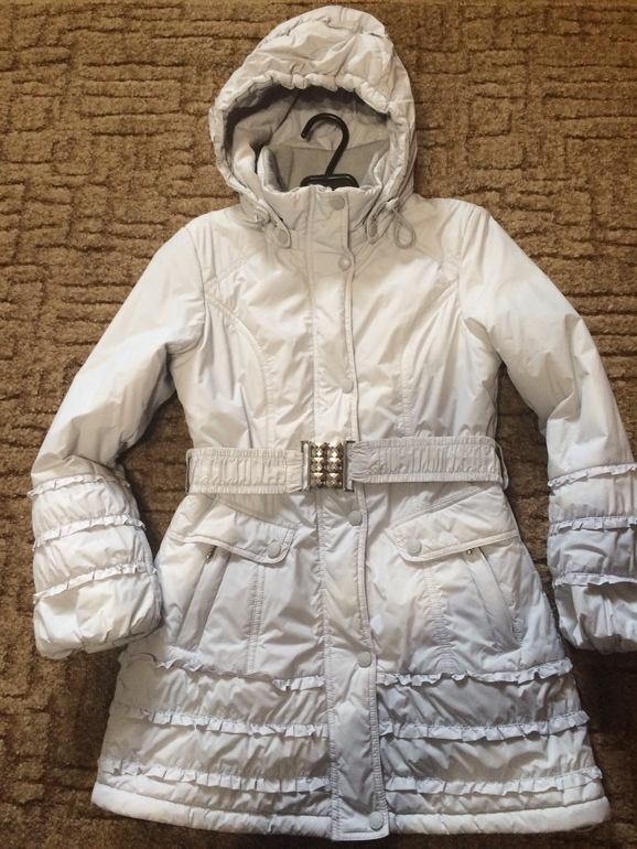 Отличное пальто для школьницы, светло-серое, но не маркое, стирается и сохнет на ура. Рукава с резиночкой. Очень аккуратненькое