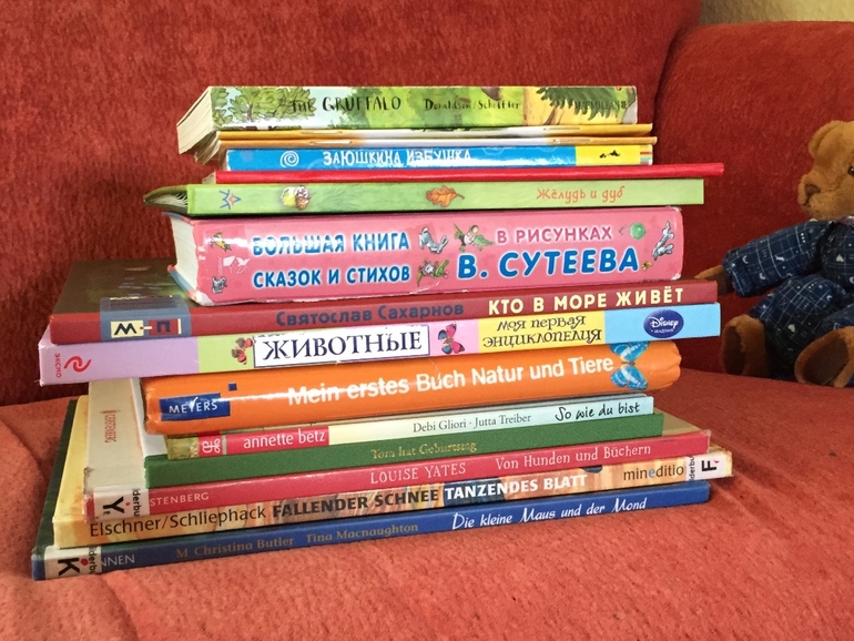 Сейчас Насте 2,3 и она очень любит, когда ей читают, как по-русски, так и по-немецки. И даже немного по-английски. В этом посте расскажу о том, с чего начиналось наше чтение. Книг в период с года до двух у нас было немного, особенно русских (доставка в Европу дорогая, самим из России возить тяжело). Поэтому к отбору я подхожу достаточно строго. Конечно, что-то привозится за компанию или нам дарят. Ниже покажу те книги, покупка которых себя оправдала.