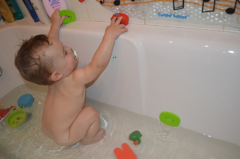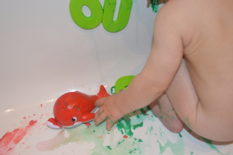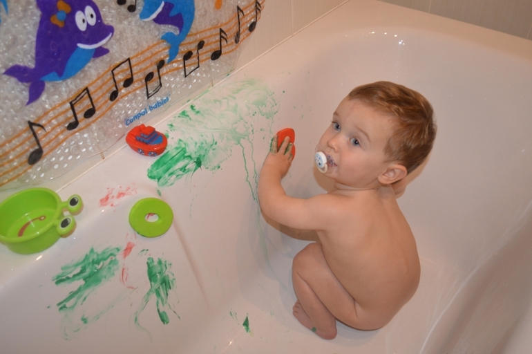 А ещё Максимка вновь привыкает к водичке. А то последние несколько месяцев у нас были истерики , при попытке посадить его в ванну. Но я и не настаивала, мыла его упорно каждый раз под душем. А тут что-то мне в голову пришло порисовать в ванне, достать игрухи, которые Максик давно не видел. По началу неуверенно играл, потом уже осмелел,и в конце я добилась, того чего хотела)) Ребёнок сел в ванну, сам того не заметя , игрался сидя в ванне , ехууу!!! А вот краски нас до сих пор не впечатляют( Во время купания мы изучали цвета- красный и зелёный.