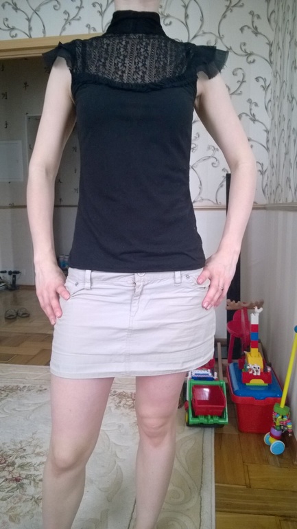 4. Футболка с кружевом под горло-одета несколько раз. 42 размер, экв.200р.