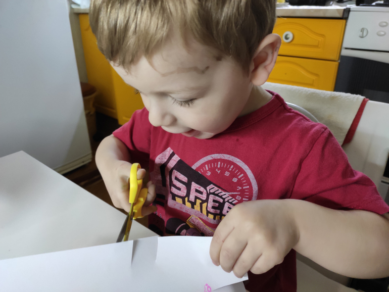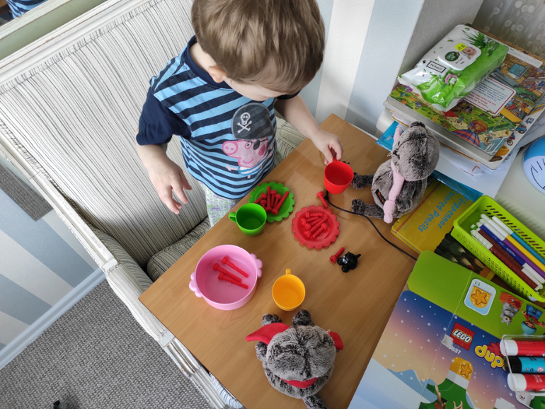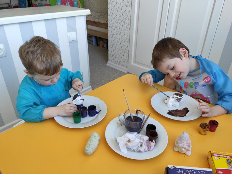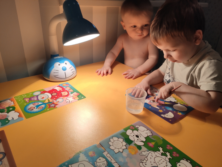 Если среднему надоедает занятие (а ему надоедает быстрее, чем усидчивому старшему), то выдают что-то "околотворческое" рядом, и тоже помогаю одной ногой там, второй тут: