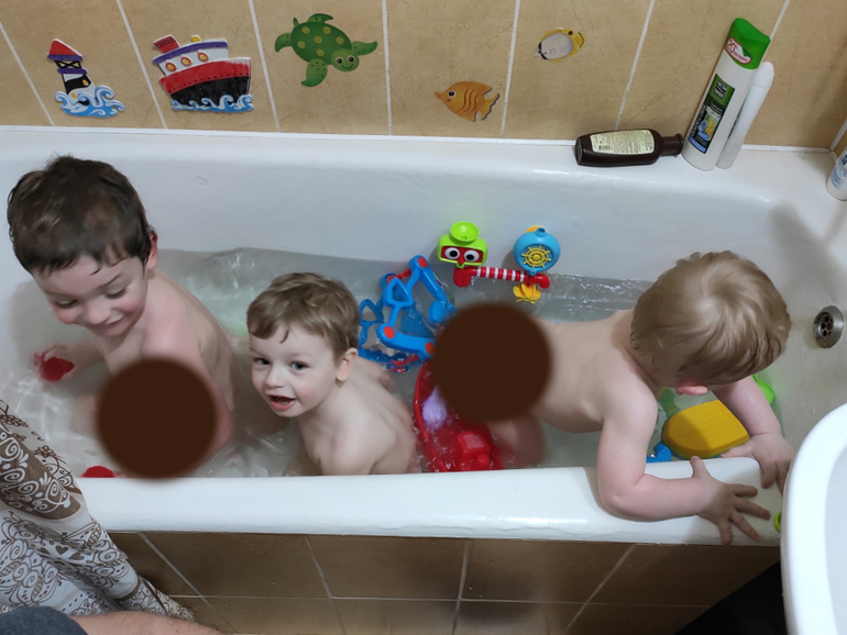 👶 2. Оказалось, что 3 ребенка действительно помещаются в нашу маленькую ванну. Да, как шпроты в банке, но никто из них не жаловался, отлично играются. Теперь они через день плавают, муж при них. Я могу делать какие-то домашние дела без "хвостиков" рядом.