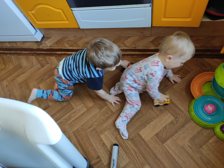 👶 9. Если Мишке вдруг надоедает игра с Ильей, то на помощь приходит Леша, который крутится возле меня. Ползают друг за другом в догонялки с машинками. Поэтому мне невыгодно и Леше мультики показывать, так он свободен и готов поползать. Мультики включаю, только когда кормлю младшего.