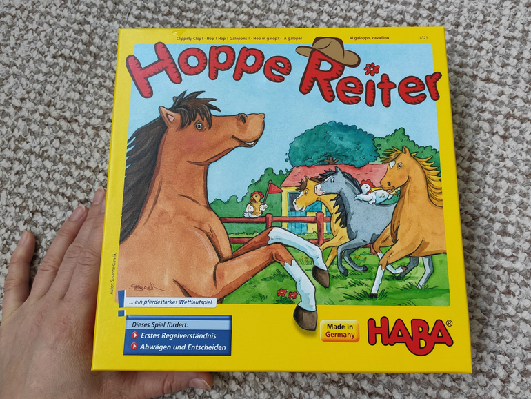 Или игра "про лошадок". Мы с детьми в восторге от нее. Я не любитель притягивать ребенка к более взрослым играм, где он вроде понимает правила, но эффективно использовать эти знания еще не может. Люблю игры по возрасту и умениям. При этом часто для 3 лет игры слишком примитивные, и мне не так интересно играть. Вот в лошадках этой проблемы нет - в ней отлично ориентируется средний сын 3.7 лет, в ней чувствует себя как рыба в воде старший сын 5.7 лет, и за счет возможности выбора действия каждый ход - мне не скучно играть в нее. Цель игры - провести свою лошадку в стойло, параллельно собирая планшет с полезными для лошади вещами. Лошадку нельзя завести в стойло, пока не собран планшет. Каждый ход вы бросаете оба кубика (один относится к шагам лошади, второй - к планшету), и выбираете, каким из них вам выгоднее воспользоваться в этот ход.