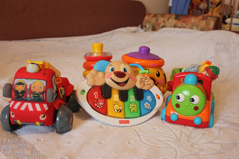 Яркий музыкальный паровозик, состоящий из локомотива и двух вагончиков.
