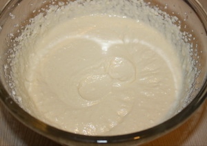 Тем временем готовим начинку. Творог протираем через сито, добавляем сметану, яйца и сахар, взбиваем миксером до однородности.