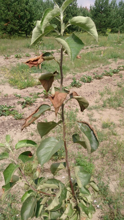Помогите определить, заболели яблоньки первого года посадки. Все было хорошо и вот неделю назад листья сначала стали скручиваться лодочкой как будто влаги не хватает, а потом и вообще на них как ожоги появились...думала муж чем то без меня обработал и сжег, нет говорит ни чем...Что за напасть такая, жалко до слез