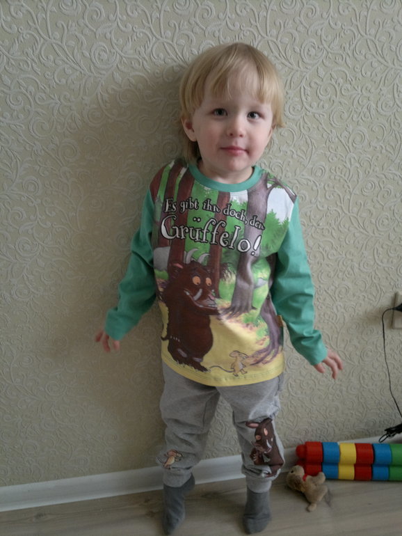 Мы вместе с сыном являемся поклонниками Джулии Дональдсон, в особенности Груффало, поэтому, когда едущие в гости, немецкие друзья спросили чего нам привезти - я быстренько пошуршала по их немецким сайтам и нашла, чего хотелось. Сын очень доволен, всем рассказывает, что это Груффало и у нас есть книжка про него. Взяла нам немного на вырост 98-104 размер. Ходили в детскую библиотеку, произвели там фурор среди библиотекарей и детей своим нарядом :)