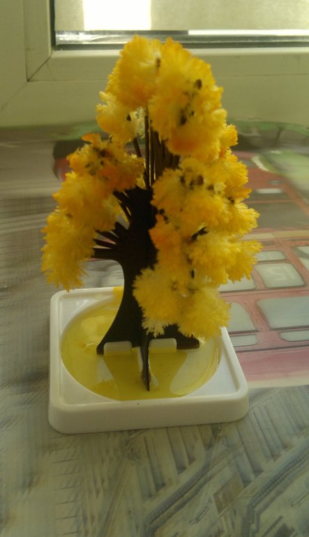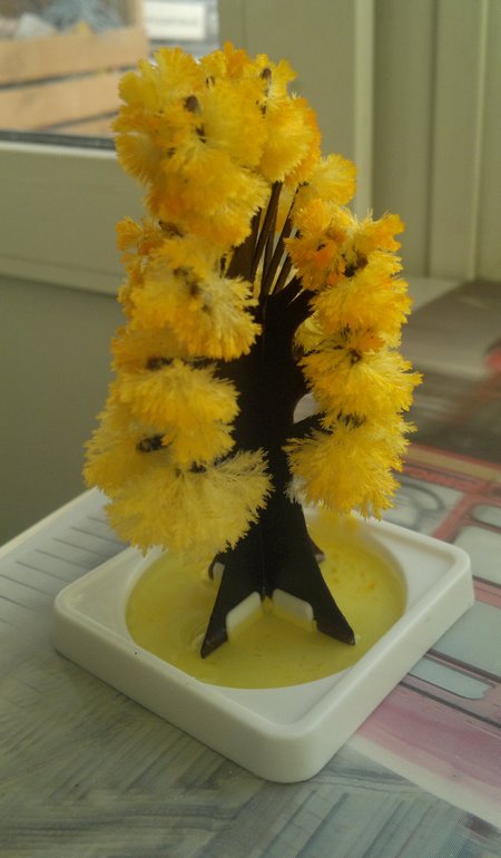 Купила за 100 руб. вот такое чудо-дерево, вечером поставили голый ствол в специальный раствор, а сегодня утром на нем выкристаллизовалась крона, старшенькая до сих пор мне не верит, говорит, что это я "всю ночь клеила"