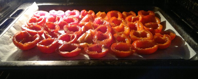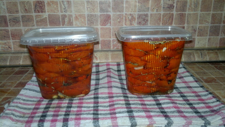 Но тут на беду, друзья отдали нам целкю корзину помидор, и я поняла, что все мы не съедим и даже не понадкусываем. Помучившись пару дней вопросом "ЧТО ДЕЛАТЬ?" И "КАК ДАЛЬШЕ БЫТЬ?", решила, что итальянские вяленые помидоры это как раз мой вариант. Вялить их естественным путем не позволяют природные условия, поэтому воспользовавшись прогрессом в виде духовки, навялила два протвиня, которые в итоге поместились в две небольшие баночки, занимающие мало места, залила их маслом с чесноком и пряными травами, потом буду это душистое масло использовать в салатах, когда помидоры съедим.