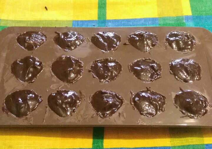 Растопить шоколад. Я больше люблю растапливать его на водяной бане, постоянно помешивая. С помощью кофейной ложечки равномерно покрыть формочки шоколадом. Не страшно, если вся форма при этом будет закапана. Ставим форму в холодильник и даем застыть шоколаду. Если формочки больше, чем у меня (глубже), то такую процедуру можно проделать пару раз.