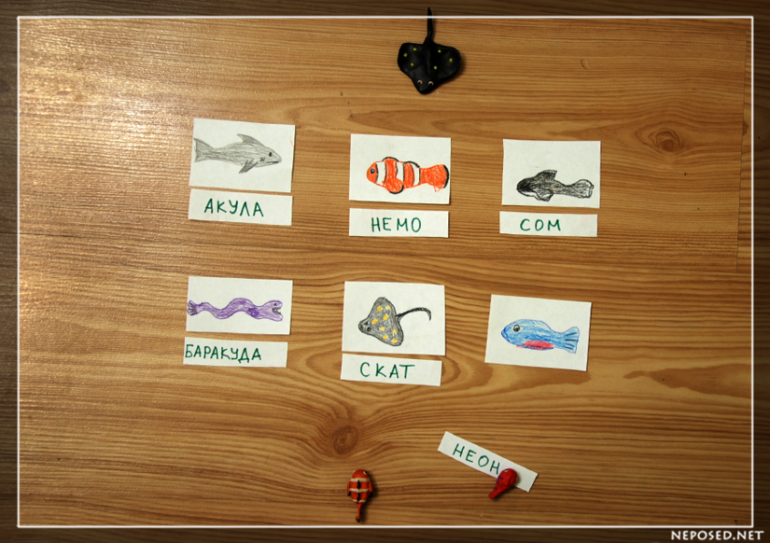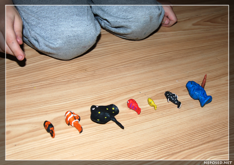 Даня искал спрятавшихся рыбок на картинке. А я пластилиновых рыбок за слепленными Даней кораллами.