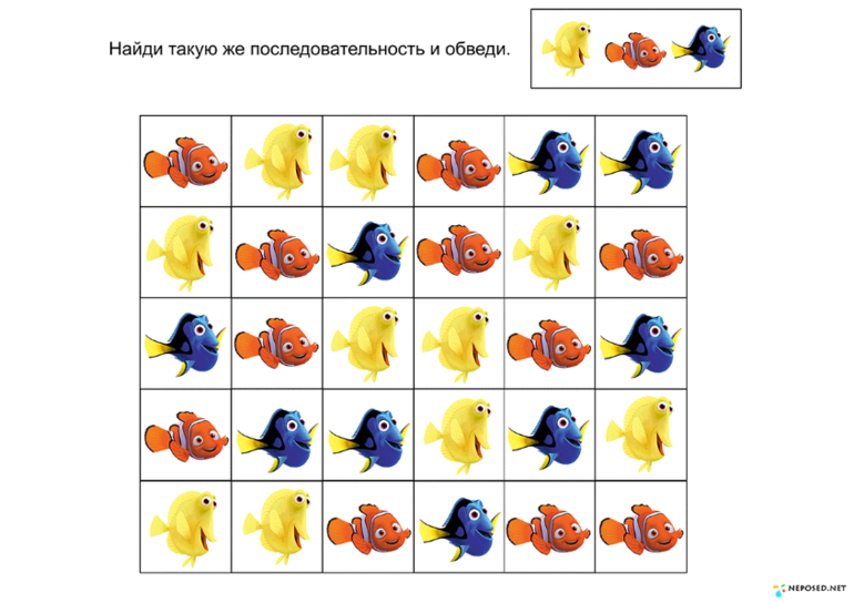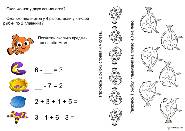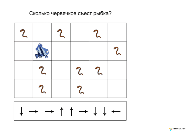 А это задание немного посложнее. Здесь не только надо провести рыбку, но и посчитать съеденных по дороге червячков, держа при этом их в уме.
