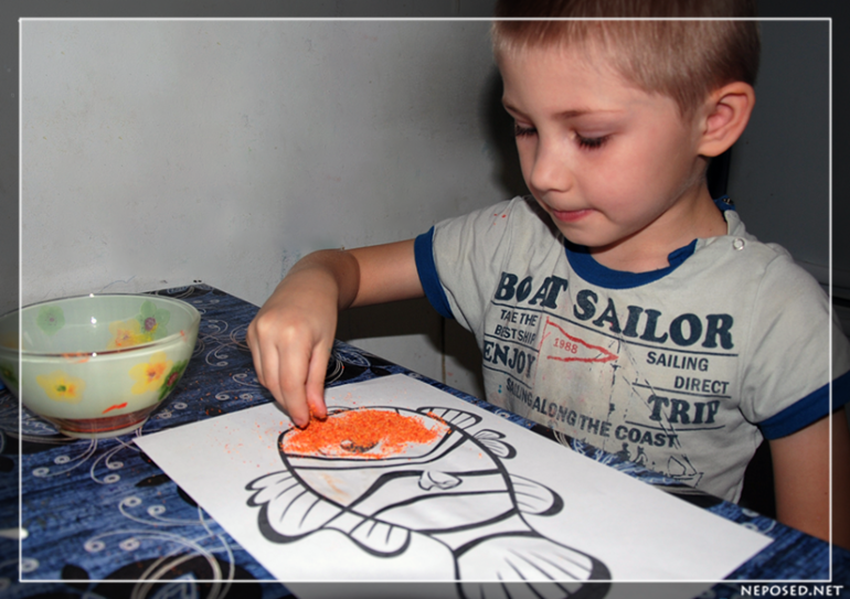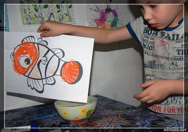 Сначала рыбку надо было всю намазать клеем, там где она должна быть оранжевой. Полоски мы так и оставим белыми. У нас был обычный клей-карандаш.