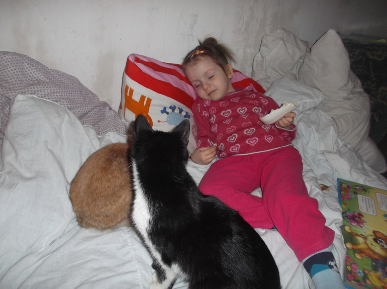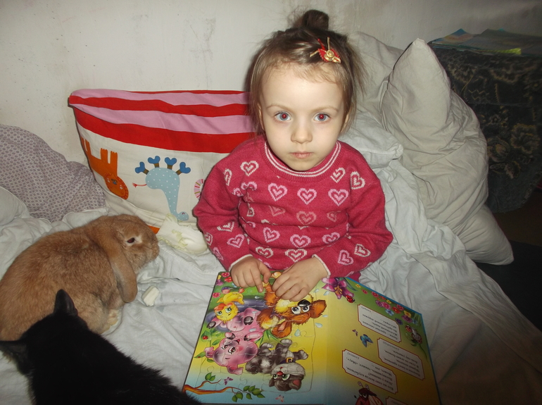 Я и моя семья.Последнее время проходят именно так. Сидим в коридоре с кошкой и кроликом и собираем пазлы. Почему в коридоре? Потому что там нет окон. Иногда и спим там же, но мелкой нравится безумно. Со всех сторон поставит подушки и играет в домик)