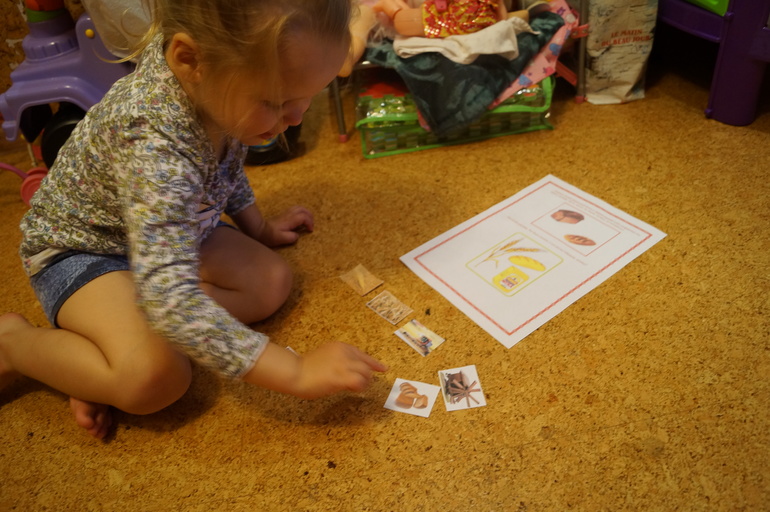 Дома начали с теории: рассмотрели картинки зерна, сельскохозяйственной техники, посмотрели презентации. Отгадывали загадки и изучали этапы получения хлеба. Разложили цепочку из картинок.