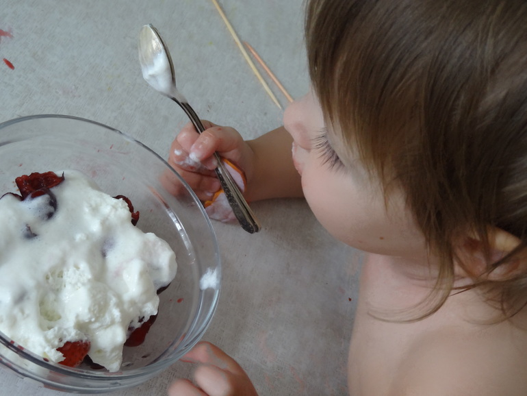 Сашенька уже много всего перепробовала и особенно ей черешня нравится