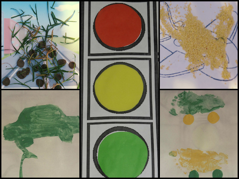 Творчество на тему "Транспорт"-аппликация из разных материаллов,отпечатки ножек,ручек и траффарет.