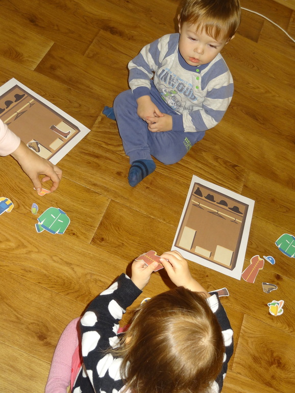 В шкафу! Прикладывание вещей по местам, в ящики, на полки и на тремпель, позже Саша потребовала -мама кеить! Так что приклеили все по местам)))