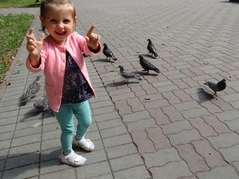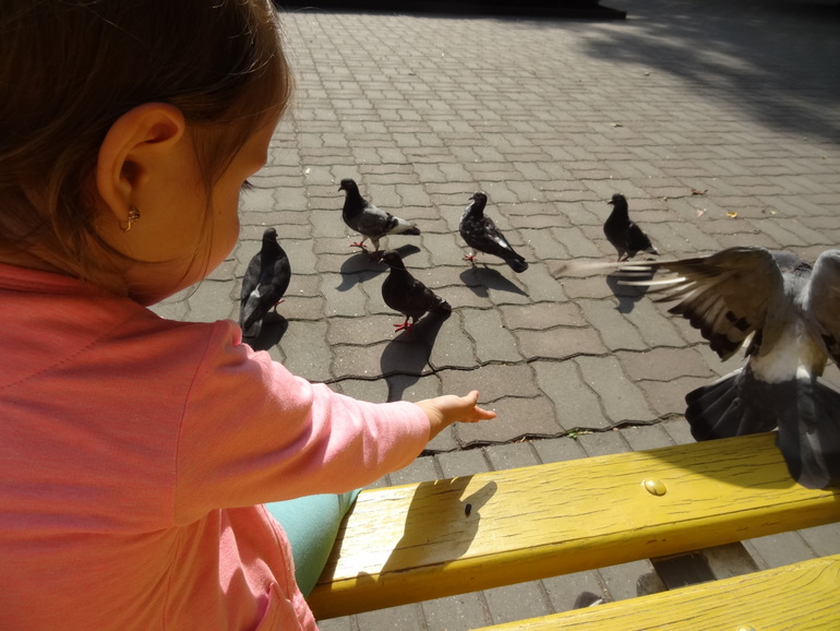 Покормили! Но на руки и голуби боялись сесть, и Саша переживала)))