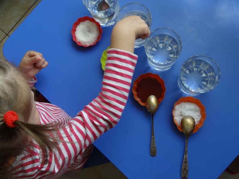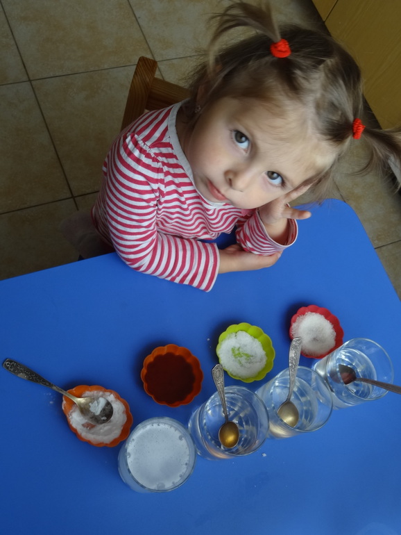 Я подготовила сахар,соль,варенье,соду. А все это Саша растворяет в воде!