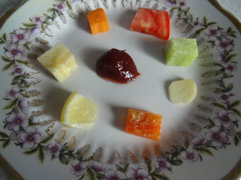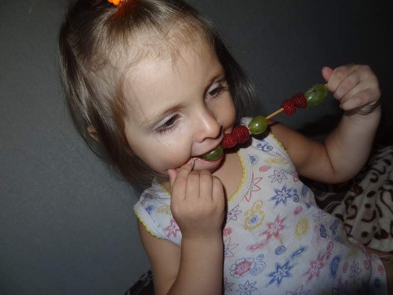 Саша закрывала глазки,открывала ротик, а я клала что-то из тарелочки. И надо было угадать, что это. Саша перепутала лишь перец с помидором, а вот с остальным справилась))))