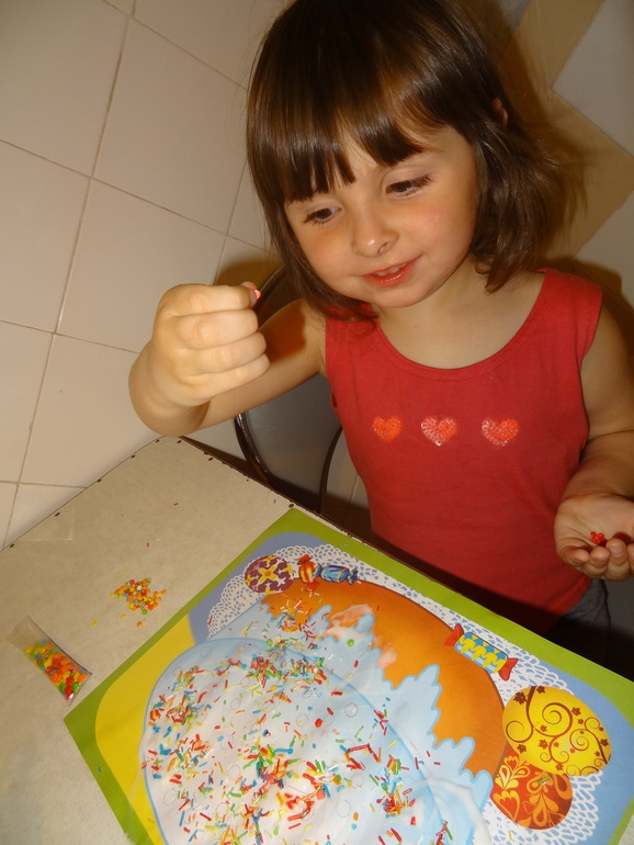 Доченька с удовольствием помогала красить яйца. И решили вот так украсить пасхальный кулич