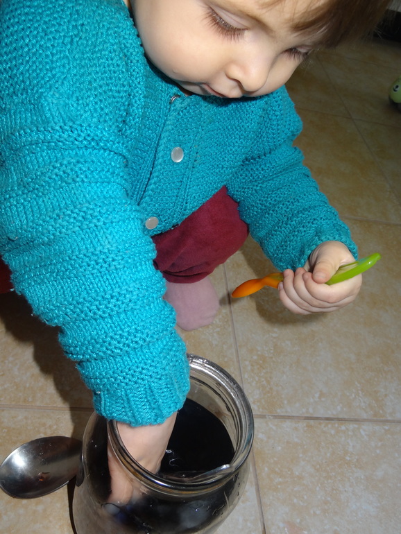 И игры с водой)))Доченька принимала активное участие в размешивании красителей в воде,но мешала только своей ложкой или рукой)))